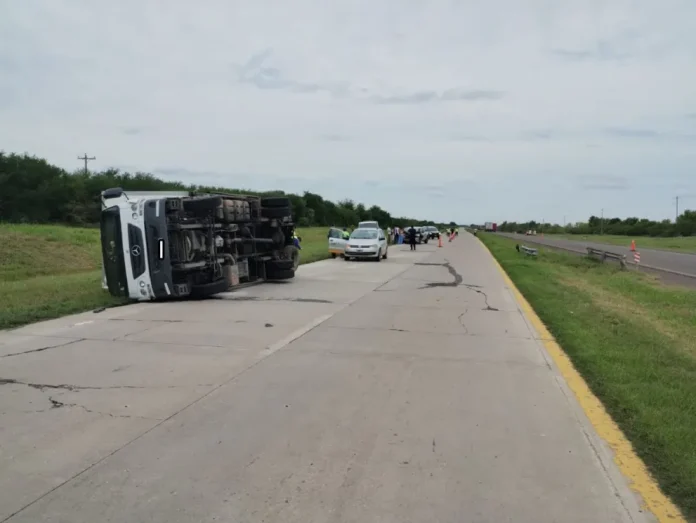 Este martes por la tarde, alrededor de las 14 horas, se registró un fuerte choque por alcance y posterior vuelco en la Ruta Nacional 14, a la altura de Gualeguaychú. El incidente fue protagonizado por una camioneta Ford Maverick y un camión Mercedes Benz Accelo de menor porte, el cual terminó volcado sobre la banquina tras el impacto.