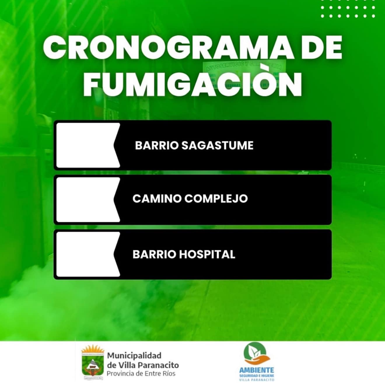 Desde la Secretaría de Gobierno del Municipio de Villa Paranacito, se dio a conocer el nuevo cronograma del Operativo de fumigación contra el dengue, que iniciará este jueves 20 de marzo, desde las 19 hs.