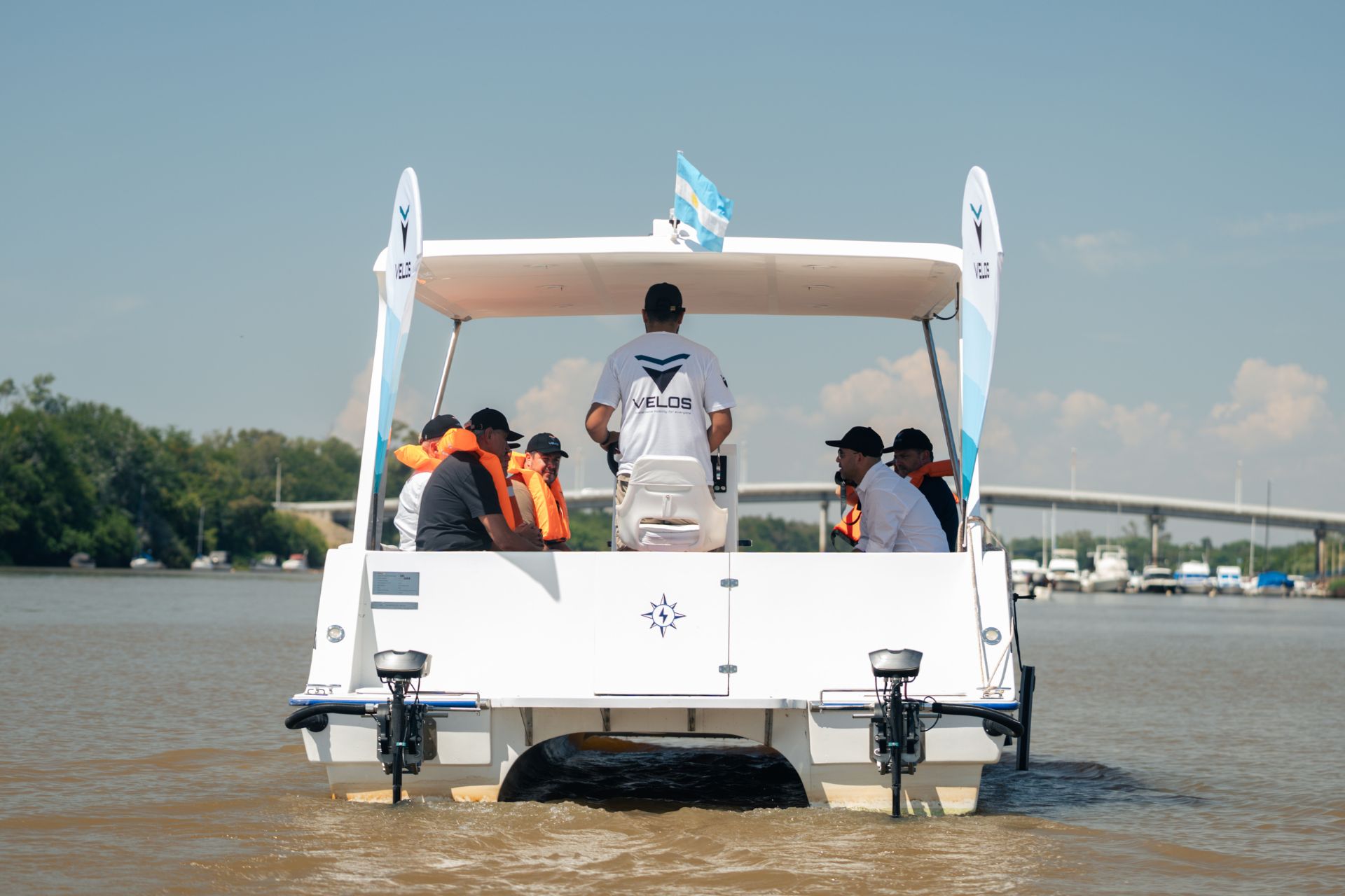 La travesía continuó con el desembarco en la Isla del Puerto, donde se compartió un almuerzo en el Parador Panza Verde, emprendimiento gastronómico que cuenta con un bar de playa flotante puesto en funcionamiento durante la temporada de verano. El espacio fue diseñado y ejecutado por Velos como una muestra de la articulación entre turismo e industria local.