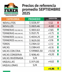 La Federación de Asociaciones Rurales de Entre Ríos (FARER) dio a conocer el informe mensual sobre el movimiento de la hacienda en pie en la provincia, correspondiente al mes de septiembre. En el período analizado, el precio promedio general registró una variación positiva del 4,86% respecto al mes anterior, con comportamientos dispares según la categoría.