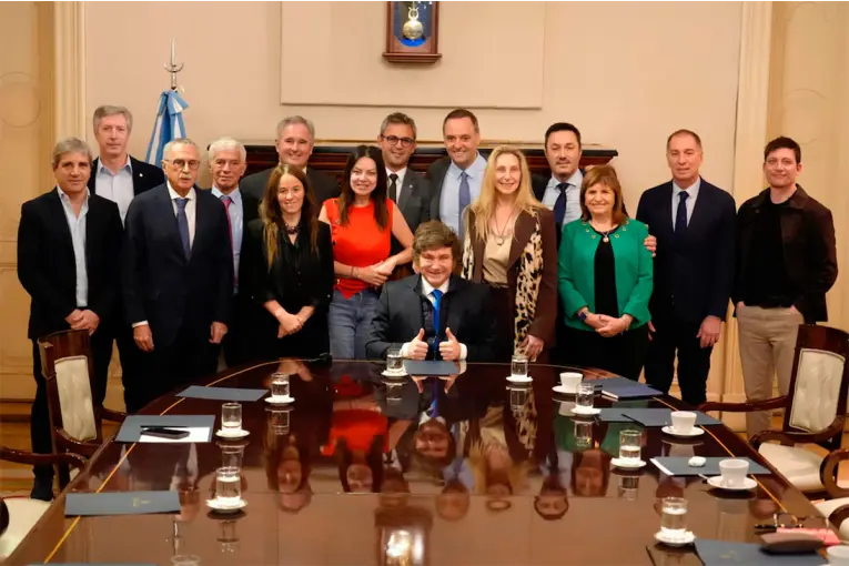 En la mesa principal también se ubicaron Sandra Pettovello (Capital Humano), Luis Caputo (Economía), Patricia Bullrich (Seguridad), Luis Petri (Defensa) y Mariano Cúneo Libarona (Justicia), quien llegó con algunos minutos de retraso. Completaron el equipo la secretaria general de la Presidencia, Karina Milei, y la secretaria Legal y Técnica, María Ibarzabal Murphy.